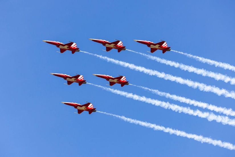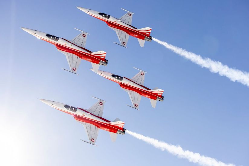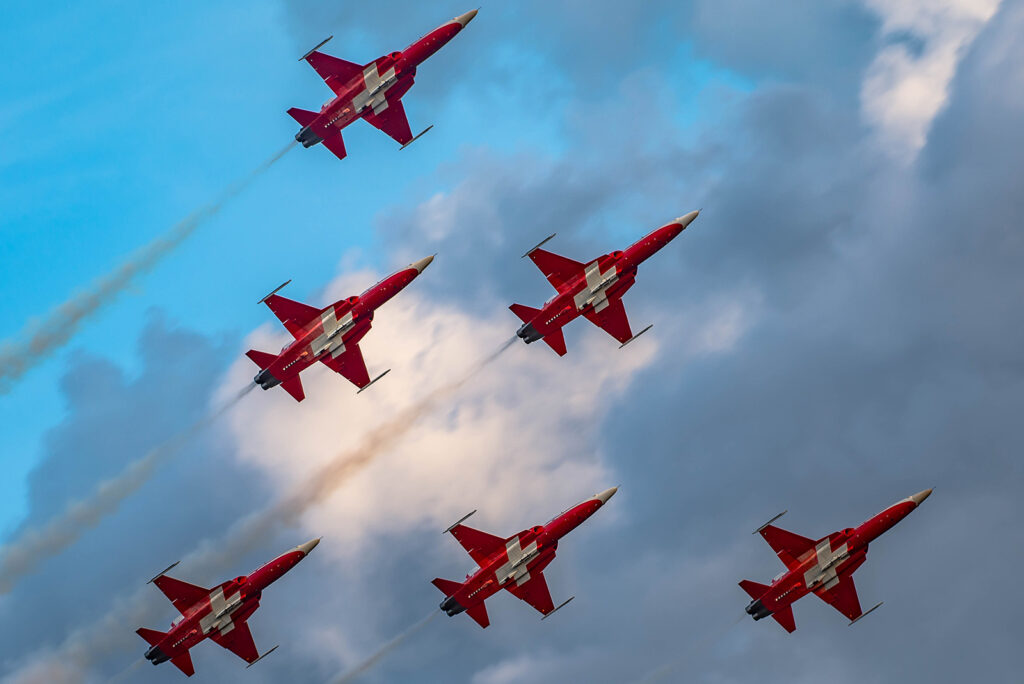 Six appareils sont engagés en vol, ce qui confère à leurs prestations un caractère unique : il s’agit d’avions de combat opérationnels, toujours en service au sein des Forces Aériennes suisses – un cas rare dans le monde des patrouilles acrobatiques.