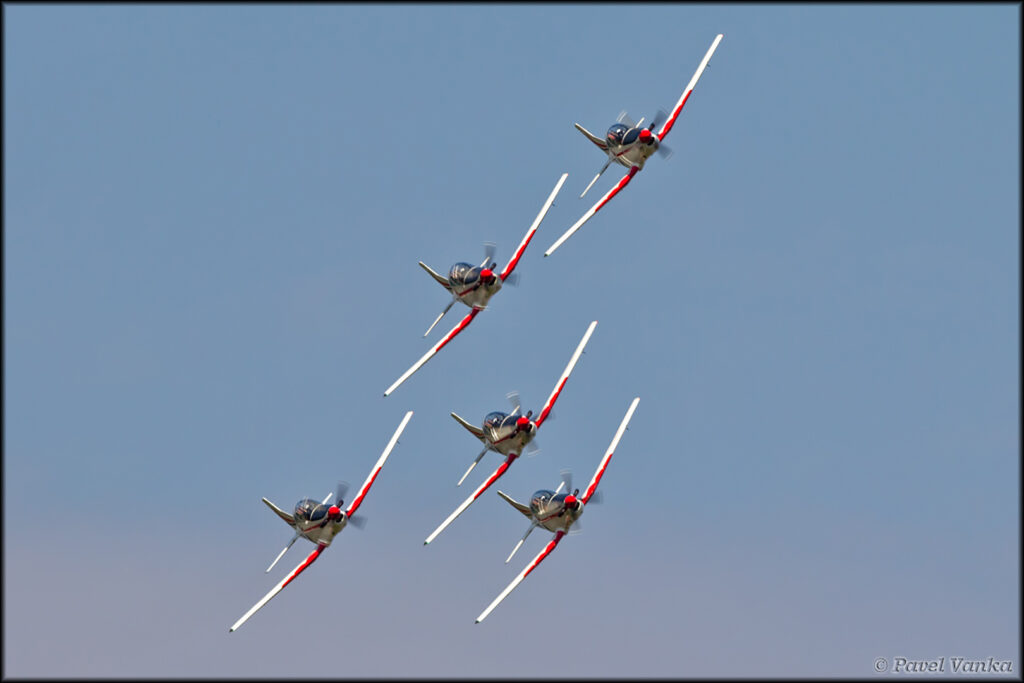 Créée pour mettre en valeur l’habileté, la discipline et le travail d’équipe des Forces Aériennes croates, la patrouille évolue sur six Pilatus PC‑9M, des avions d’entraînement robustes et très maniables.